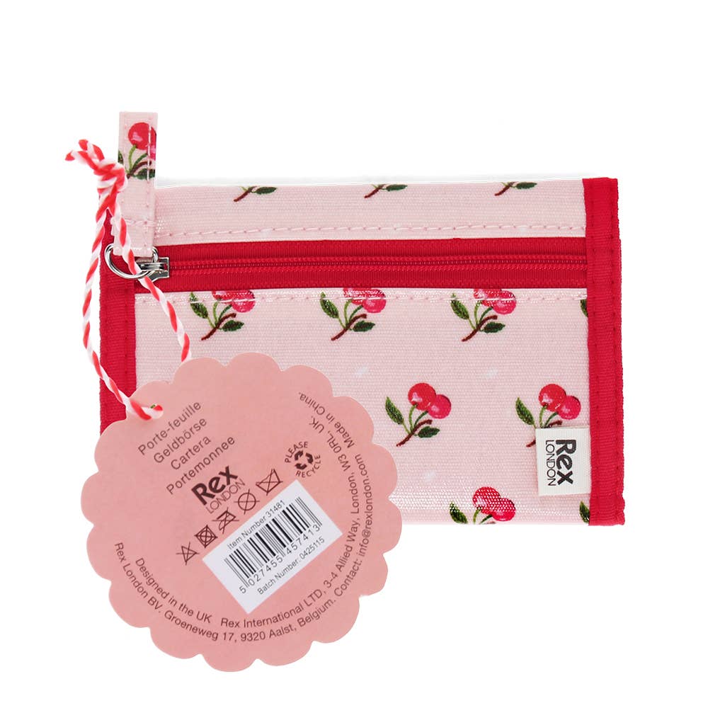 Children's tri-fold wallet in pink and red, adorned with bright bunches of red cherries.