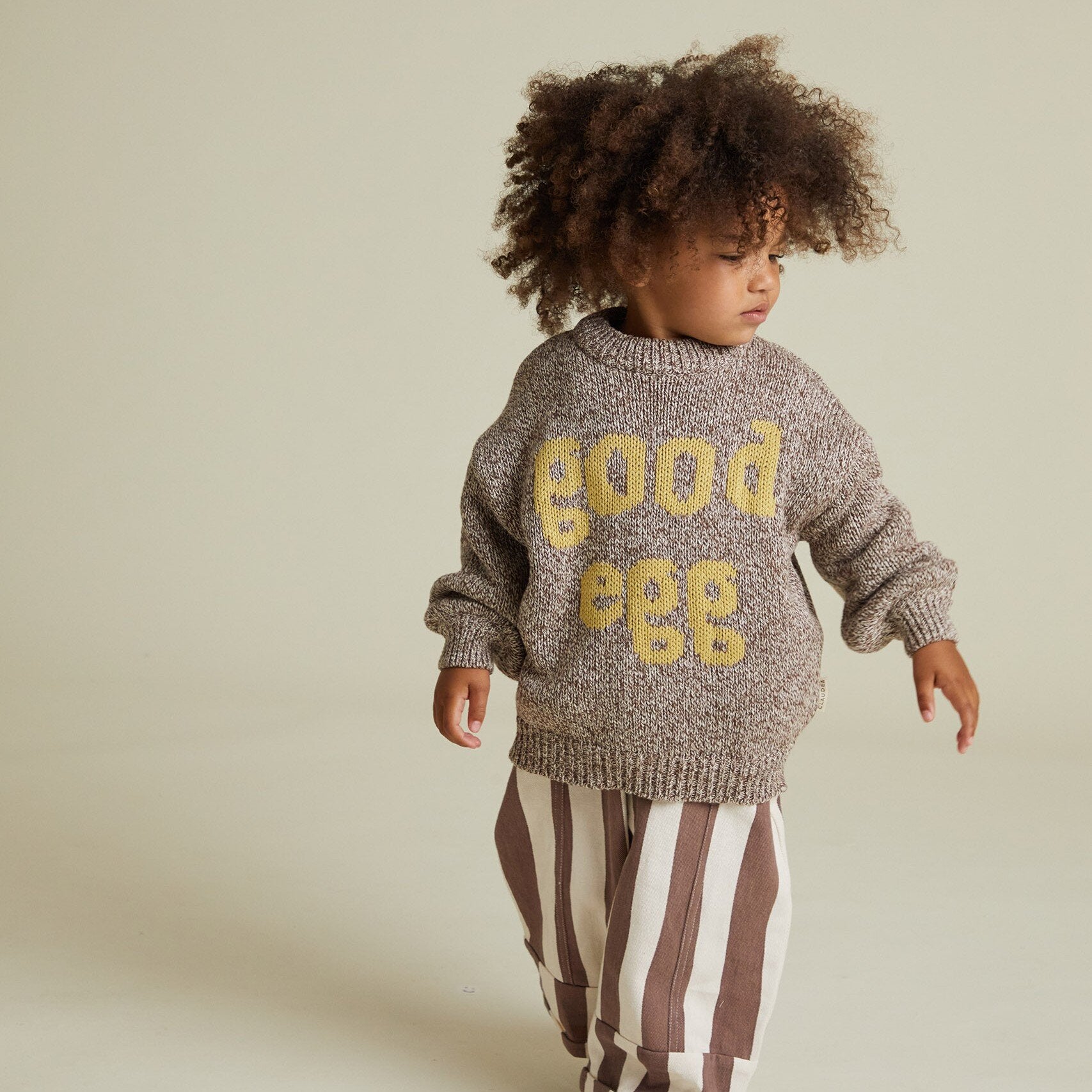 Introducing the ' Greta Good Egg Sweater', made from 100% Organic Cotton, this sweater is a must-have for SS26 collection. In a soft coco tone, featuring our iconic oversized fit - this premium unisex knitwear piece is carefully crafted using our signature twisted yarn technique. Look out for the egg arm patches as well! This is the perfect wardrobe staple, it layers over any outfit to offer an effortlessly stylish look, transitions seamlessly from a breezy summer evening to a cosy winter day, and has lots of room to grow into.