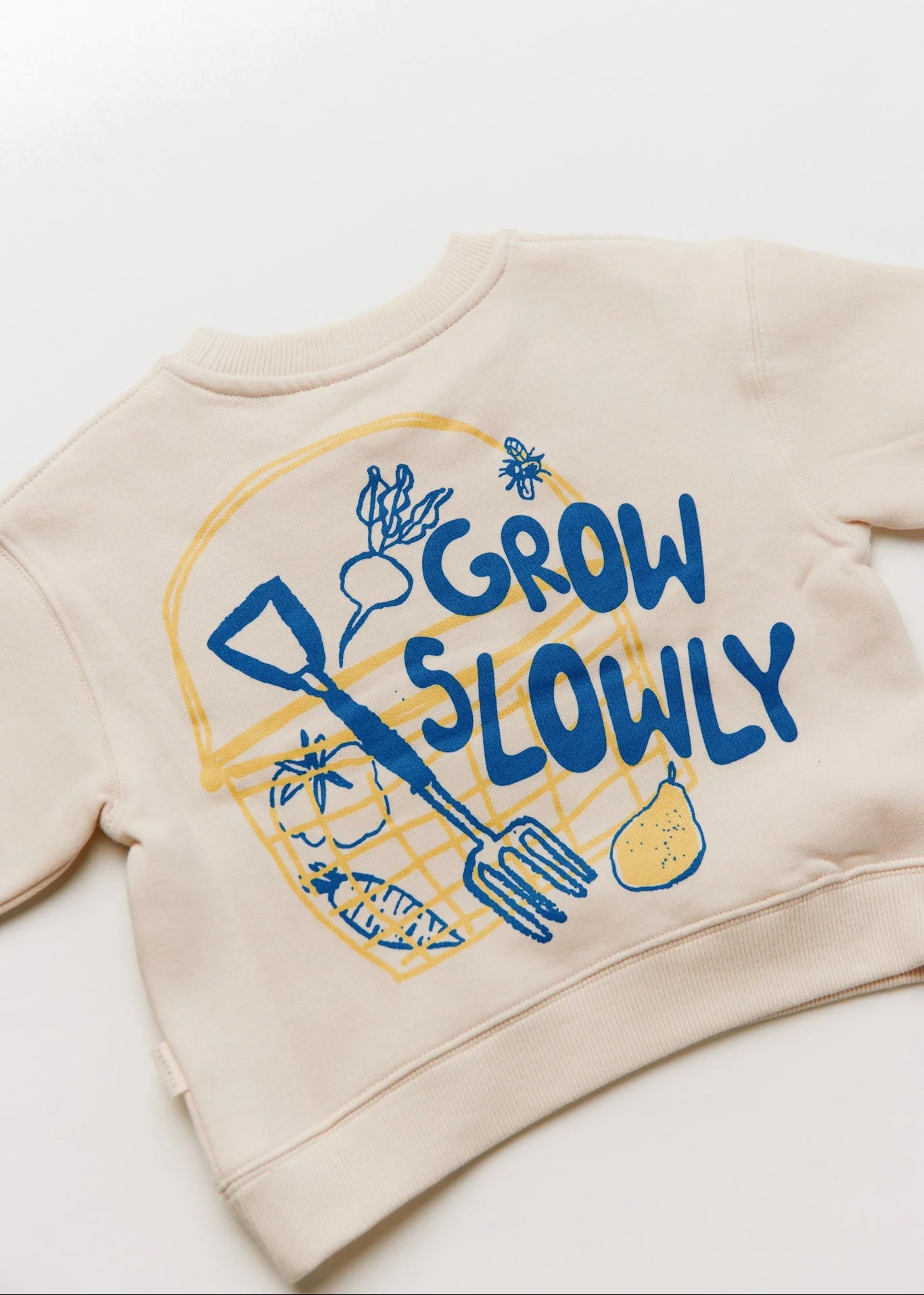 The Carner Grow Slowly Sweat, is made from our signature soft 100% organic cotton, in a beautiful cream shade. This sweat has an oversized fit and slouchy dropped shoulder shape, including a ribbed neck, wrist and hem cuff detailing. This iconic, playful sweatshirt goes with just about everything and transitions seamlessly through the seasons; it’s the perfect piece to layer over our shorts and t-shirts, or under our gilets and overalls.