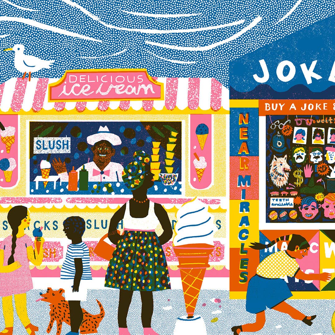 On one side are the colourful seaside shops and stalls that glow with fun and colour.